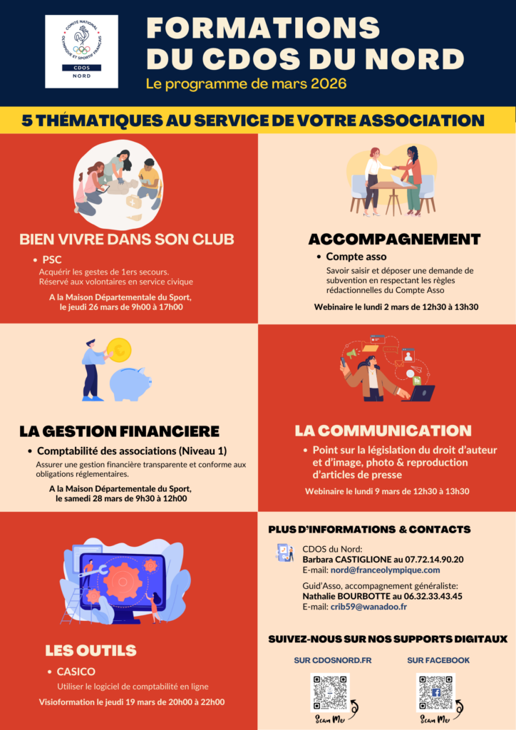 La formation des Dirigeants Bénévoles et des salariés est l’une des missions essentielles du CDOS du Nord afin de soutenir les associations dans leur projet de structuration et de développement. La mise en place de ces actions ne serait possible sans le concours financier du Conseil Départemental du Nord, du Service Départemental Jeunesse, Engagement et Sport du Nord, de la Préfecture du Nord, et de l’Agence Nationale du Sport.